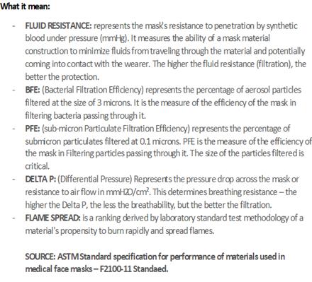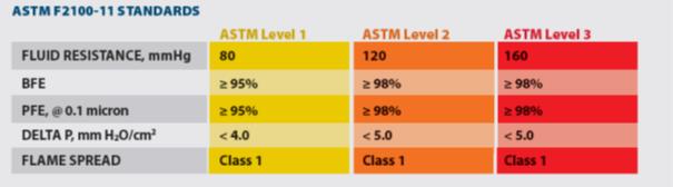 Mask materials are covered under ASTM specifications and are designated as one or more of the following performance levels.