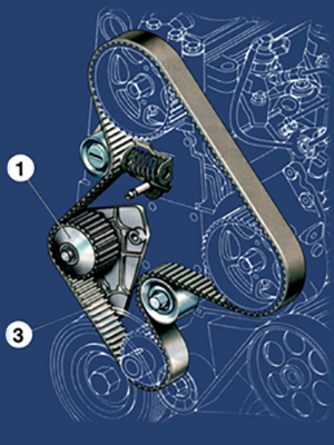 In both cases replacing the water pump, we dismount multi V-belt (2) or timing belt (3).